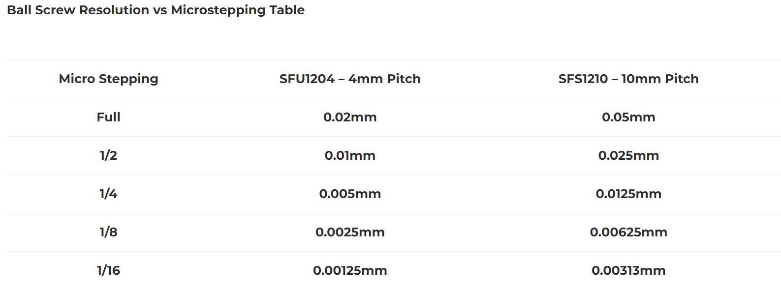 The Z-axis SFU1204 Ball Screws have a 4mm pitch so the Z calculated resolution is 0.0025mm.