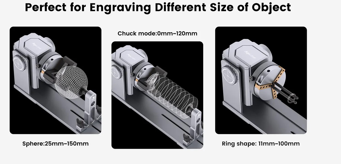 The maximum supported diameters are: Cylinders: 1-120mm, Spherical objects: 25-150mm, Rings: 11-100mm.