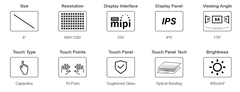 8inch DSI Capacitive Touch Display - 800×1280, IPS Panel, Optical Bonding Toughened Glass Panel, 10-Point Touch