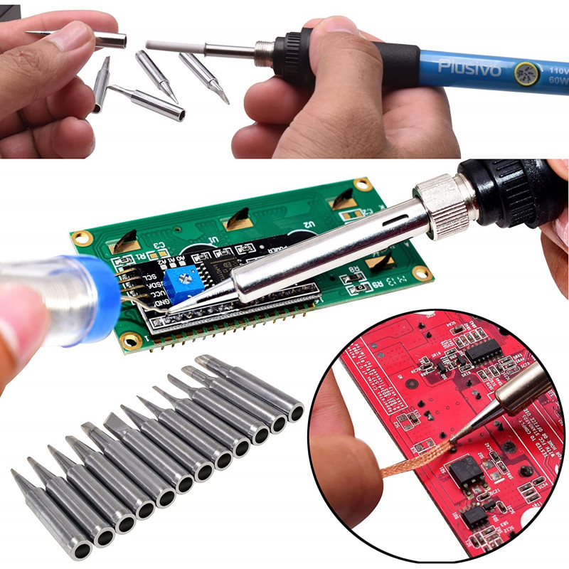 The Plusivo Soldering Tips Kit includes 12 soldering iron replacement tips. Choose among the 12 different sizes and shapes (900M-T models: B, I, K, 0.8D, 1.2D, 1.6D, 2.4D, 3.2D, 1C, 2C, 3C, 4C) with about 0.24" base outer diameter and inner diameter of about 0.16” for soldering stations and other applications, can handle almost any soldering projects, home DIY soldering, appliance, electrical and electronics repairs, circuit board welding, other fixing jobs, hobby crafts, etc.