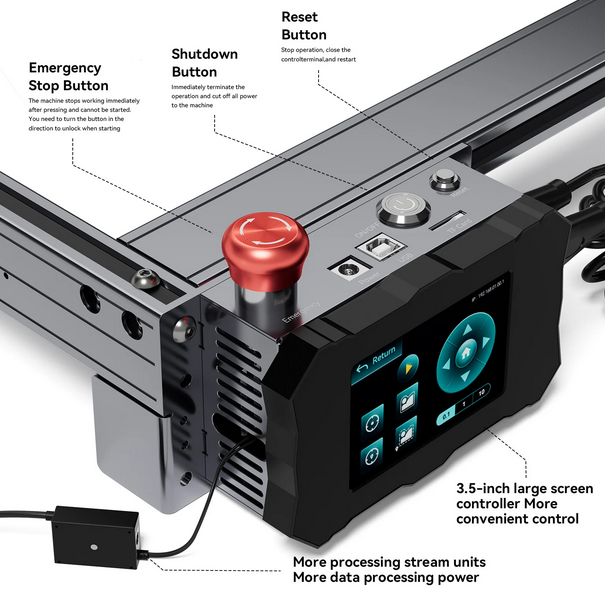 16. Safety Protection: configured with an emergency stop button. If there is an accident, you can stop the machine at any time to run. Reset switch and limit switch make the engraving process safer.