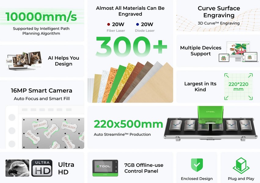 Features: Dual laser capability, precise engraving, high-speed engraving, versatile material compatibility