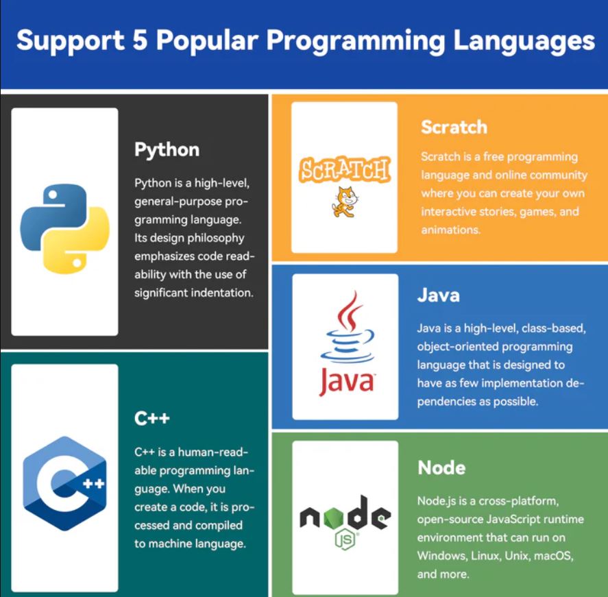 Supports Multiple Languages: The Raspberry Pi 4 Kit offers versatility with support for 5 programming languages - Python, C, Java, Node.js and Scratch, providing a diverse programming learning experience.