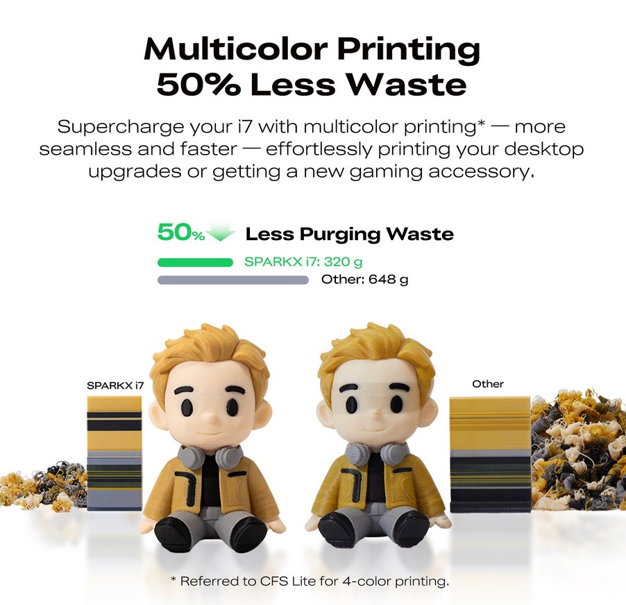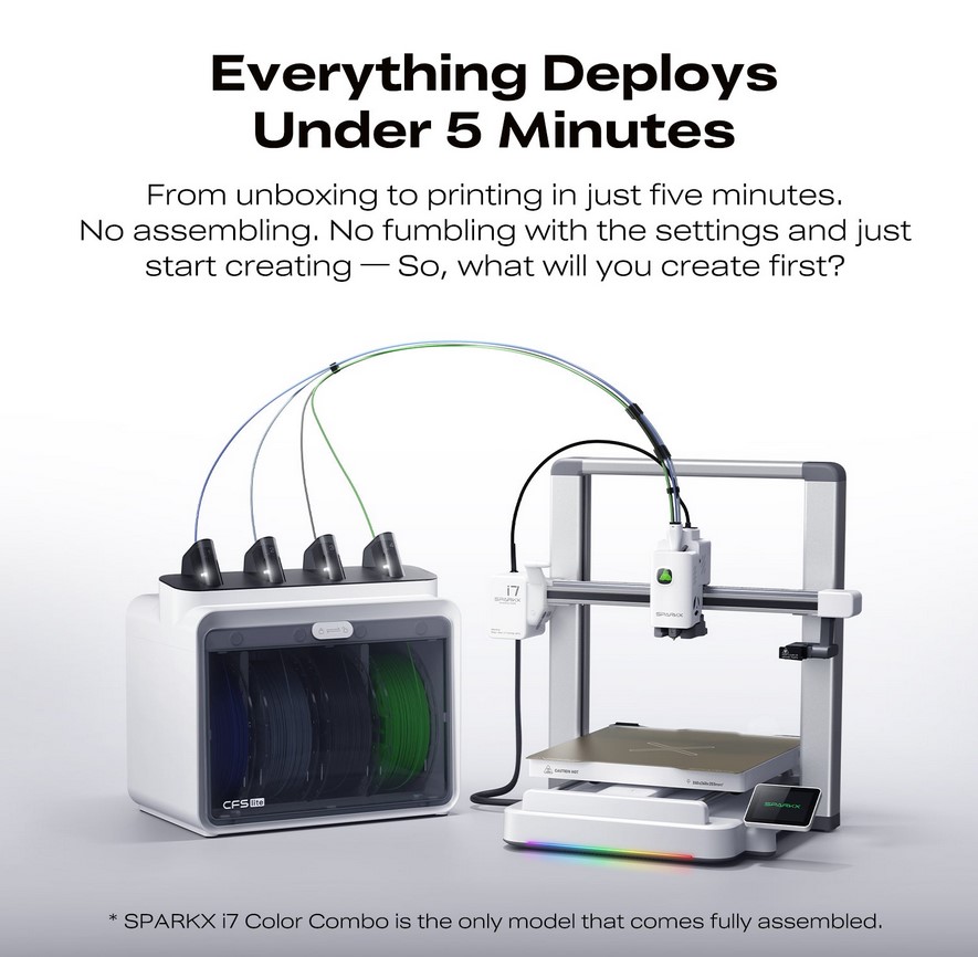 The SparkX i7 Combo includes the new CFS Lite multicolour system, allowing you to print with up to 4 × 1kg filament spools. Designed for ease of use, it features front-facing access and dedicated space for desiccant packs to keep your filament dry and ready for optimal printing performance.