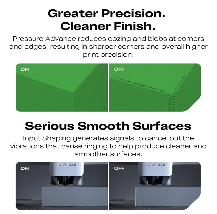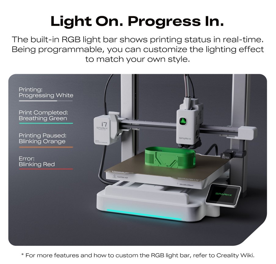 Featuring a generous build volume of 260 × 260 × 255 mm, the SparkX i7 is equipped with an integrated camera for real-time failure detection, along with automatic flow calibration and tuning to ensure consistent, high-quality prints straight out of the box. Whether you’re a beginner or an experienced user, this printer delivers reliable performance from day one. The addition of Quick-Swap Hotends makes switching between applications seamless and efficient. An integrated RGB light strip provides real-time print status updates and can be fully customised via its Klipper-based firmware. Paired with ultra-quiet motors, the SparkX i7 operates smoothly in the background, while still offering a visually engaging experience when needed.