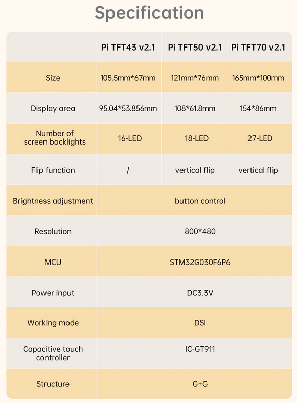 The BIGTREETECH PI TFT V2.1 Touch Screen Series is a high-quality display solution designed for seamless integration with the Raspberry Pi and Raspberry Pi 2. Available in 4.3-inch (TFT43), 5-inch (TFT50), and 7-inch (TFT70) sizes, these capacitive touchscreens offer smooth and responsive control, making them ideal for DIY projects, 3D printer interfaces, smart home dashboards, control panels, and embedded systems.